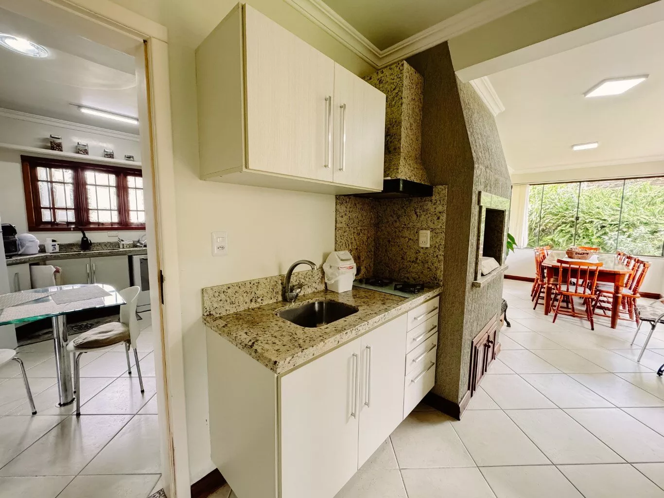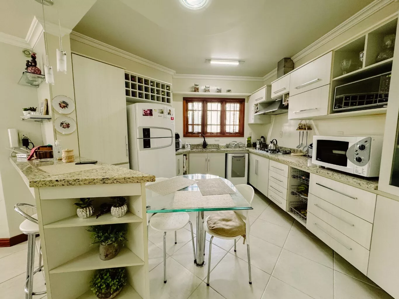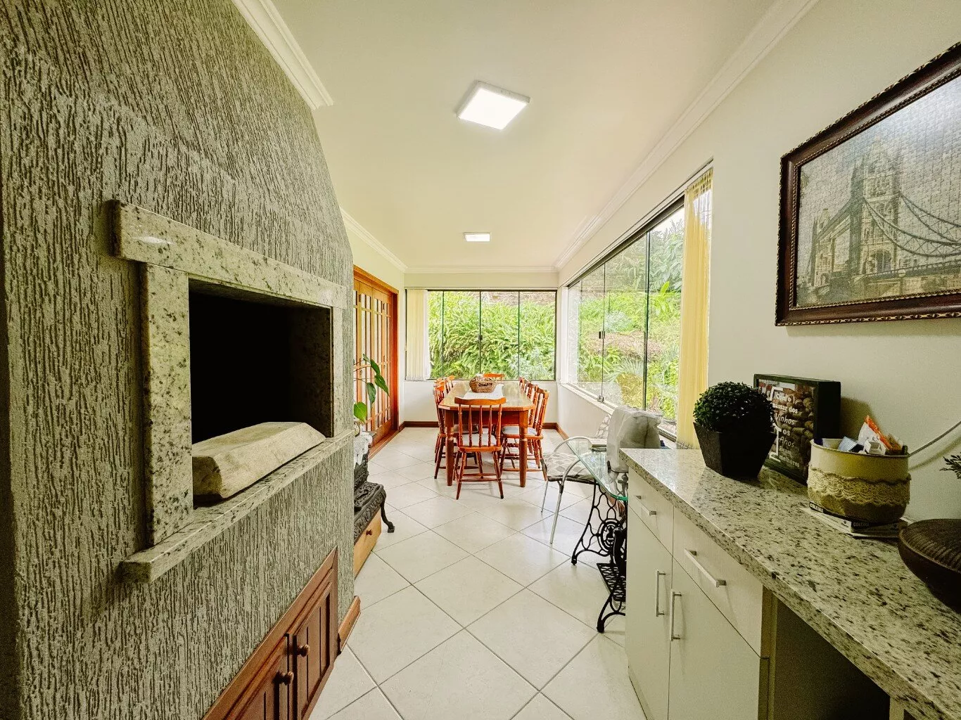 Com 04 dormitórios, sendo 01 suíte com closet e banheira de hidromassagem, banheiro social, lavabo, sala com lareira, sala de TV, sala de jantar, cozinha com copa, despensa, garagem para 02 carros, espaço gourmet com churrasqueira;